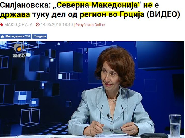 Η καθηγήτρια της Νομικής Σχολής του Ιουστινιανού του Πρώτου, Γκορντάνα Σιλιάνοφσκα-Ντάβκοβα (Гордана Силјановска-Давкова) στην εκπομπή «60 λεπτά» της τηλεόρασης Alfa, τόνισε ότι «το όνομα «Μακεδονία» κανείς δεν έχει δικαίωμα να το αλλάξει, επειδή αυτό είναι ό, τι έχουμε κληρονομήσει και ως εκ τούτου το ‘μακεδονικό’ έθνος έχει το δικαίωμα να το διατηρήσει, γράφει το σλαβικό δημοσίευμα των Σκοπίων.