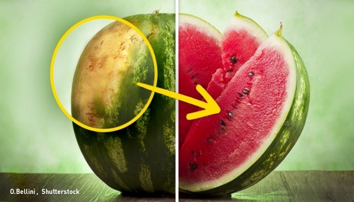 Αυτό το κίτρινο σημάδι δείχνει πώς καθόταν το καρπούζι στο χώμα. Τα ώριμα καρπούζια έχουν πορτοκαλί σημάδι, όχι άσπρο.