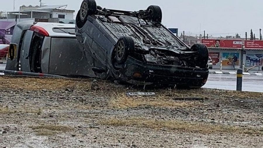 Οι άνεμοι ήταν τόσο ισχυροί που τέσσερα οχήματα που βρίσκονταν παρκαρισμένα σε χωματόδρομο δίπλα στην λεωφόρο αναποδογύρισαν.