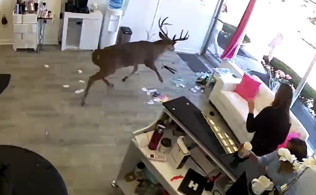 Το βίντεο που διέρρευσε στο διαδίκτυο, από την κάμερα ασφαλείας του κομμωτήριου δείχνει μια κομμώτρια να κουρεύει έναν πελάτη, την ώρα που μια άλλη πελάτισσα περιμένει υπομονετικά της σειρά της στον καναπέ. Δευτερόλεπτα αργότερα, ένα ελάφι εισβάλει μέσα από την τζαμαρία, πάνω από την ανυποψίαστη πελάτισσα και τρέχει πανικόβλητο μέσα στο κατάστημα.