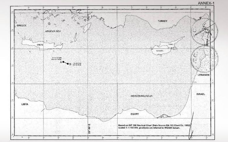 Άρθρο Α (1) Τα όρια της υφαλοκρηπίδας και της ΑΟΖ της Τουρκικής Δημοκρατίας και της κυβέρνησης της Λιβύης στην Μεσόγειο ξεκινούν από το Σημείο Α (αναφέρονται οι συντεταγμένες) και τελειώνουν στο σημείο Β (αναφέρονται οι συντεταγμένες). Οι πλευρές συμφώνησαν σε αυτά τα όρια.