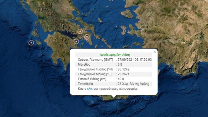 Σύμφωνα με την αναθεωρημένη λύση του Γεωδυναμικού Ινστιτούτου το επίκεντρο εντοπίζεται 23 χιλιόμετρα βορειοδυτικά της Άρβης στο νομό Ηρακλείου. Επισημαίνεται ότι ακολούθησαν δύο μετασεισμοί 4,5 και 3,7 Ρίχτερ στην ίδια περιοχή που εκδηλώθηκε ο πρώτος σεισμός, ενώ η μετασεισμική δραστηριότητα συνεχίζεται.