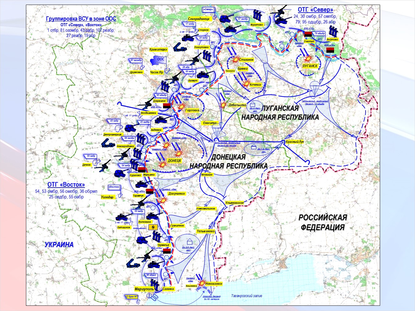 «Το χτύπημα εκτελείται από τις δυνάμεις των 30 μηχανοκίνητων, 17 τανκ και 95 ταξιαρχιών αεροπορικής επίθεσης των Ενόπλων Δυνάμεων της Ουκρανίας με την υποστήριξη 26 ταξιαρχιών πυροβολικού. Το άμεσο έργο είναι να φτάσει στη γραμμή Alchevsk-Yenakiyevo εντός τριών ημερών. Το περαιτέρω καθήκον της ομάδας είναι να φτάσει στα σύνορα της Ρωσικής Ομοσπονδίας εντός δύο ημερών», λέει η «Λαϊκή Πολιτοφυλακή του DNR».